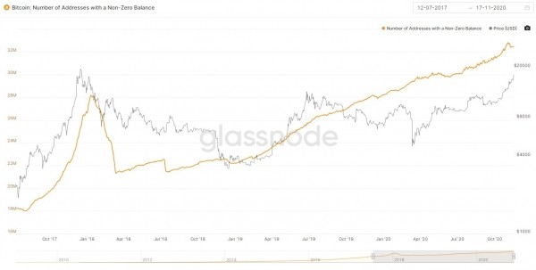 Кроме того, по данным Glassnode, сейчас существует 32,5 млн адресов с ненулевым остатком. Показатель постоянно растет с марта 2018 года после резкого снижения в январе того же года.