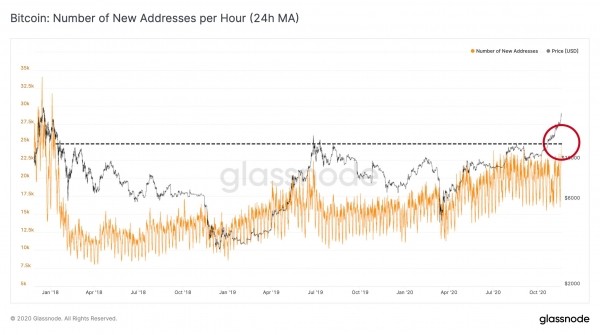 Около 25 000 новых адресов регистрировалось в блокчейне биткойна за один час в среду, свидетельствуют данные Glassnode. В последний раз на этих уровнях показатель находился в январе 2018 года.